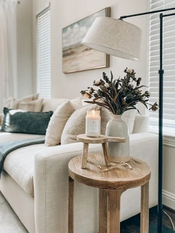 Getting the lighting right in a new build home can make all the difference between sterile and stark, to warm and cosy. If you are faced with lots of spotlights, simple additions such as floor lamps and table lamps will help to soften the lighting. I particularly love a chunky table lamp with a large tapered shade to add some drama to a room.