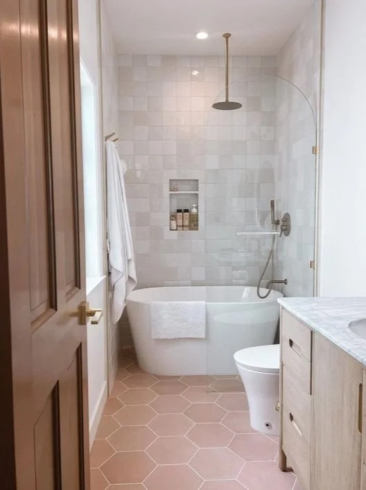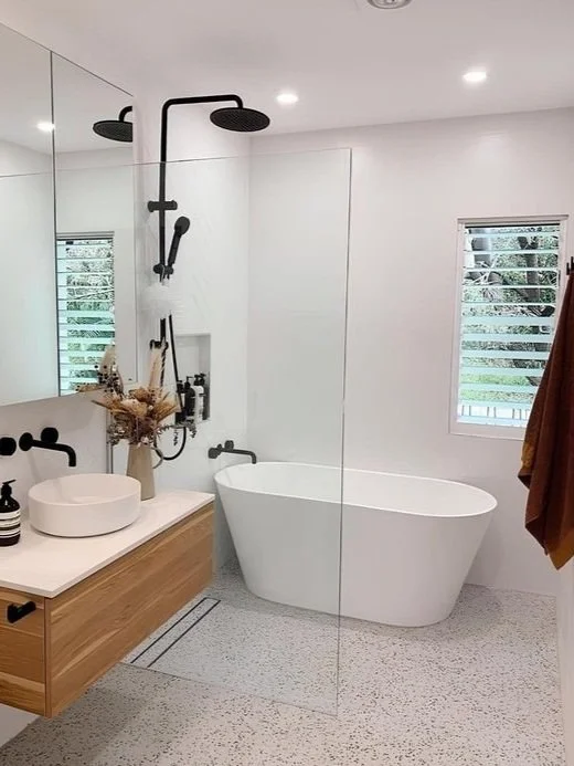 If you don’t have the space for a separate shower cubicle, consider having a wet-room style shower right next to the bath. Opt for sleek hidden plumbing, practical but stylish shower ledges/niches and a simple minimalist one-panel shower screen.