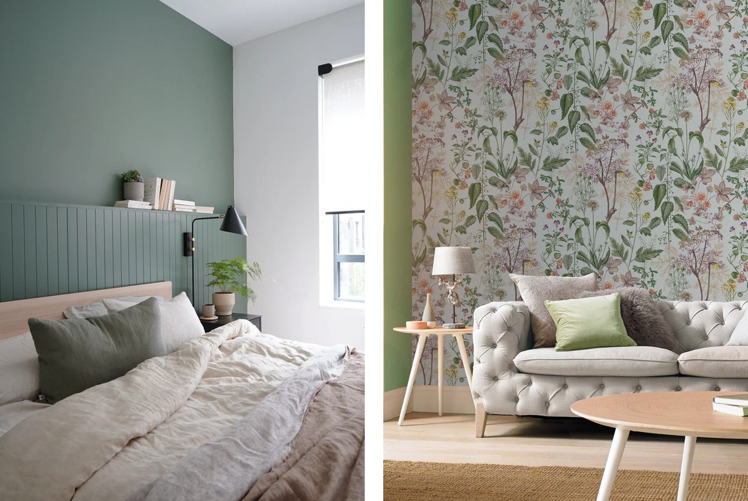 Not so keen on a full green room, but want to add a touch of green somewhere? A feature wall in a shade of green is a simple way to achieve this. Go one step further and use patterned wallpaper with pops of green for added interest.